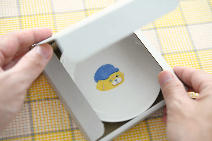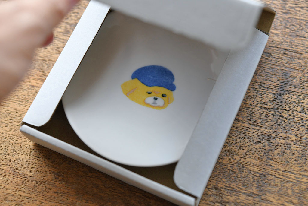 ちゃこのイラスト付き・寄付付き小皿は、上のように1枚ずつ箱に入った状態でお届けします。ぜひ、ちょっとしたギフトなどにもご活用ください。