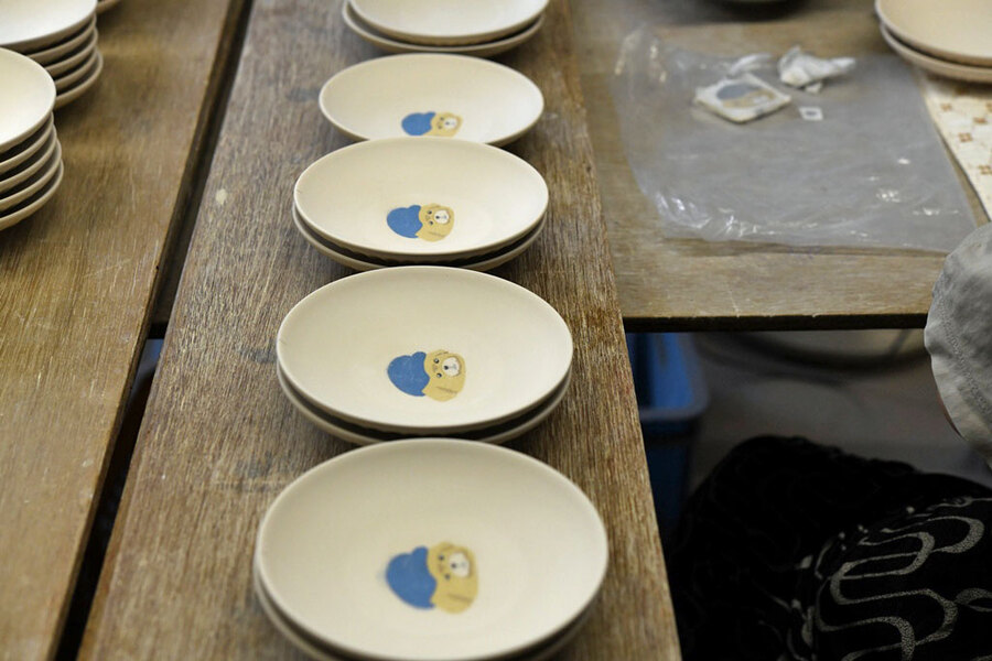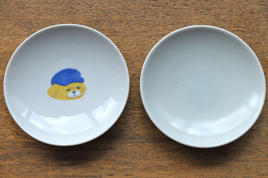 そして、2枚前に掲載している写真の通り、イラストの色味をきれいに出すために、白ごはんcomの灰釉シリーズの釉薬とは異なる“透明釉”を使って制作していただいています(左が今回の透明釉のお皿、右が灰釉の灰釉小皿(2枚組セット)のお皿です)。