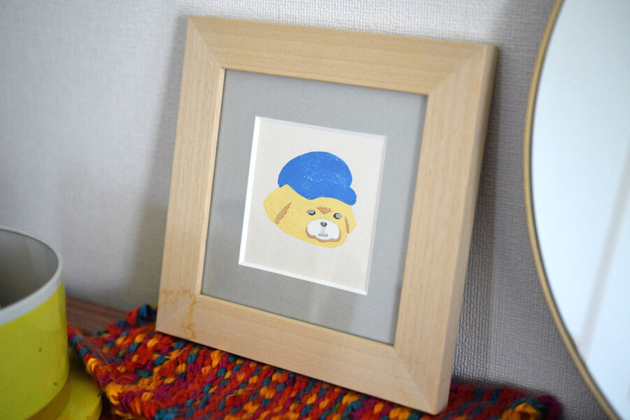 イラストの制作は、白いまつ毛をパチパチ瞬きするちゃこの可愛らしさを、カラーの版画で刷ってみようと思い、僕がイラストを描いて木版画にして彫り、見本となるものを刷りました。