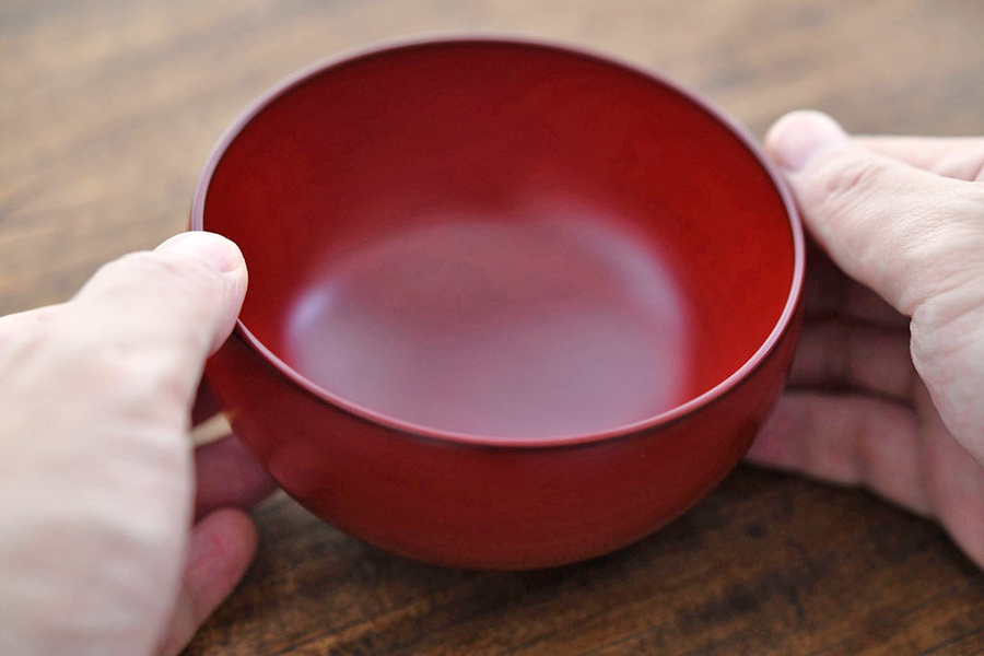 この朱色のお椀で言えば、黒色の中塗り漆を塗り、研いで、その後朱色の上塗り漆を塗って仕上げられています。