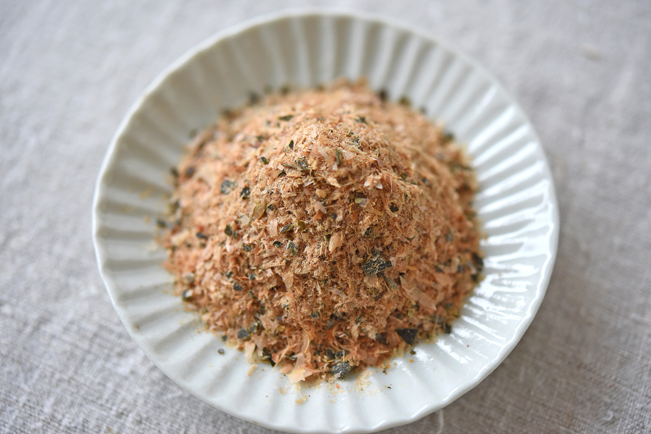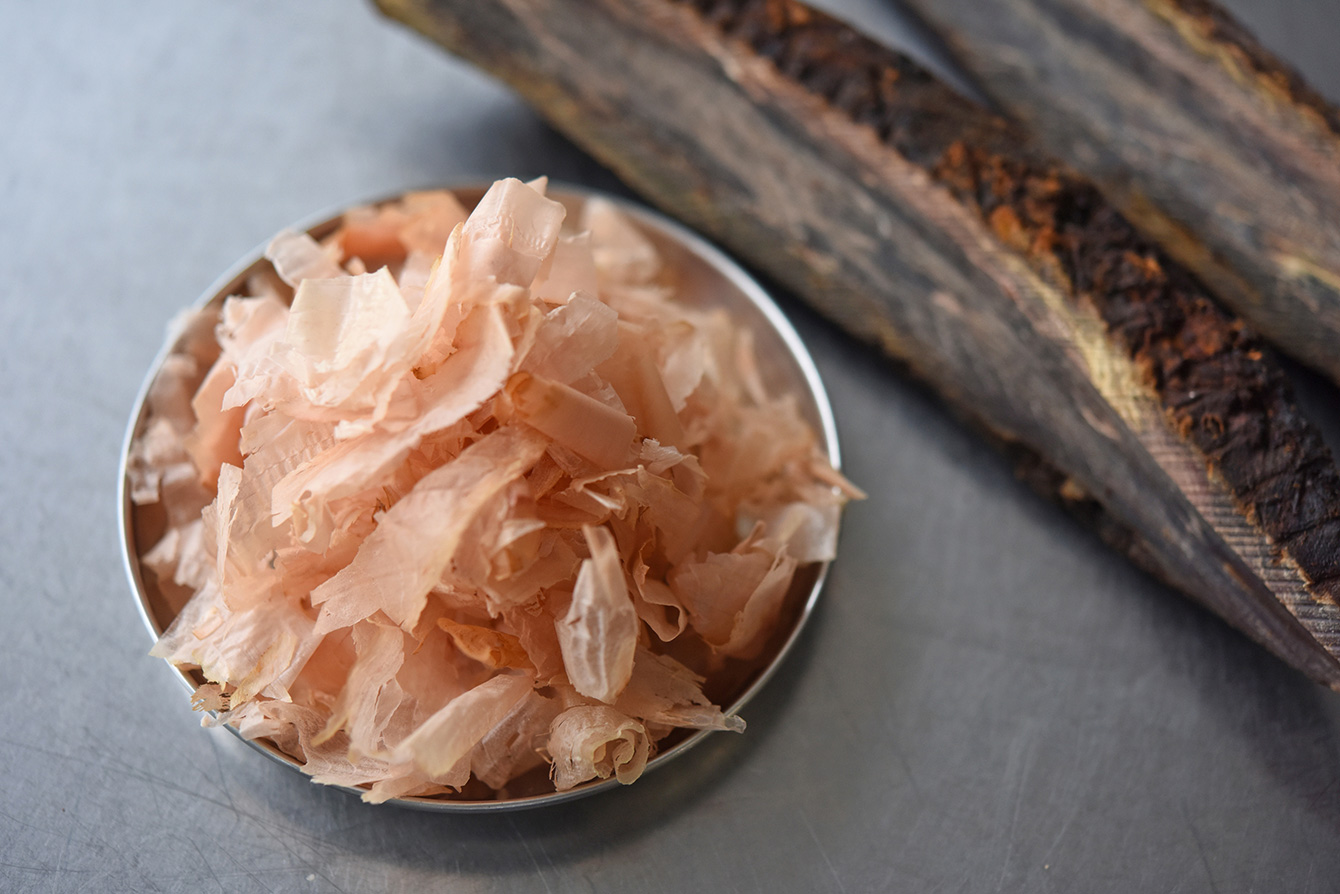 そこで、かつお節に関しては料理屋さんなどでも行っている、だし汁の風味を悪くしやすい“かつお節の血合い”という部分を削り落としたものを使用しています(下の写真のように薄削りにした後に、細かく粉砕しています)。また、昆布はうま味が他の昆布に比べて格段に強い“羅臼昆布の天然物”だけを使うことにしました。