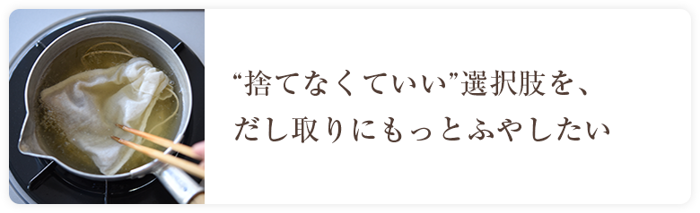 もう一つは、「事前に市販のお茶パックなどの袋に入れ、だしパックと同じようにだし取りをする」というやり方です(詳細はこちら)。使い捨てでないものがあるといいなと思い、白ごはん.comのオリジナルの繰り返し使える『だしこし袋』も一緒に販売しています。