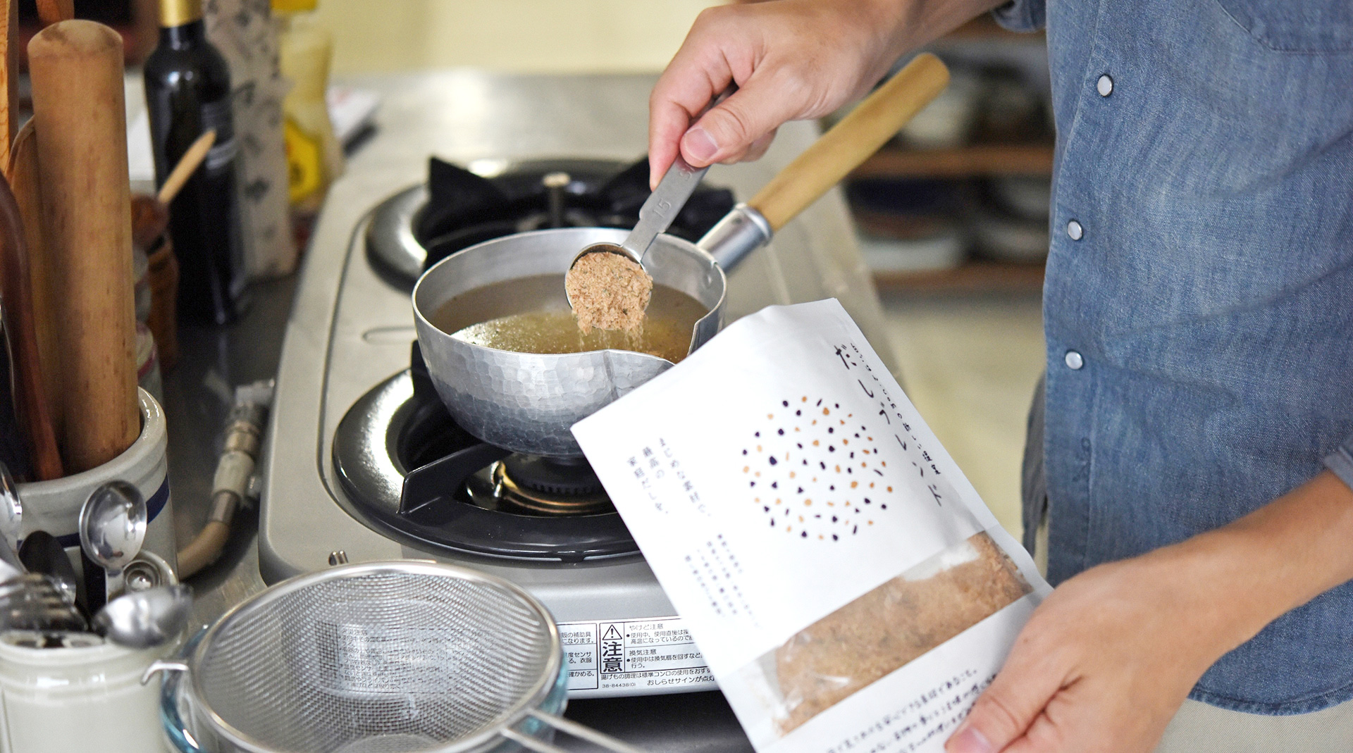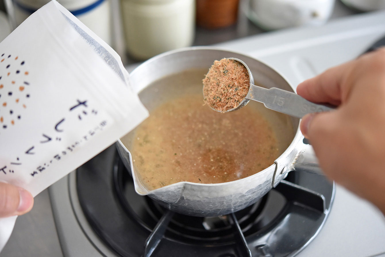 けれど、和食の世界の昆布とかつお節のだし取りでは、自分で取りたい分量に合わせ、昆布を切って、かつお節をはかって、無駄のないだし取りをすることができます。このだしブレンドもそうで、自分の必要な分量、そして自分の取りたい濃さが取れるように、自分で量って入れるスタイルにしました。