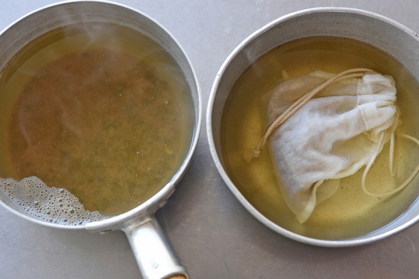 ひとつは「鍋にだしブレンドをじかに入れ、だし取り後に目の細かい茶こしなどでこす」というやり方です(詳細はこちら)。目の細かい茶こしがなければ、ざるにさらしやキッチンペーパーをしいてこすこともできます。